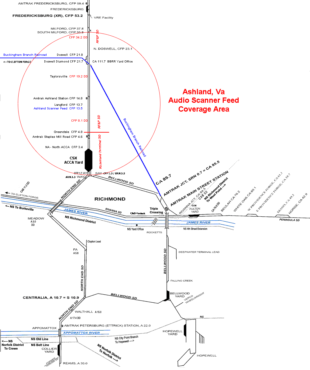 Channels Monitored on the Ashland Audio StreamCSX RF&P SD (x RF&P): Washington, DC to Richmond, Va Connects on the north end to the CSX Capital SD at M Street, CFP 113.8, in Washington, DC and on the south end to the CSX Richmond Terminal SD at Greendale, CFP 4.8, in Richmond, Va RF&P Railfan Guide Signal List AAR Channel 20: 160.410 - Dispatcher (BD Desk - Baltimore, MD) AAR Channel 96: 161.550 - Road Defect Detectors: CFP 8.1 - Glen Allen CFP 19.6 - Taylorsville CFP 34.2 - Pleasant Hill CSX Richmond Terminal - ACCA Yard (x RF&P), North End (x ACL), and Bellwood (x SBD) SDs: Connects on the south end to the CSX North End SD, ARN 3.3 at West AY and the CSX Bellwood SD, CFP 1.3/SRN 3.5, at South AY and Connects on the north end to the CSX RF&P SD, CFP 4.8, at Greendale