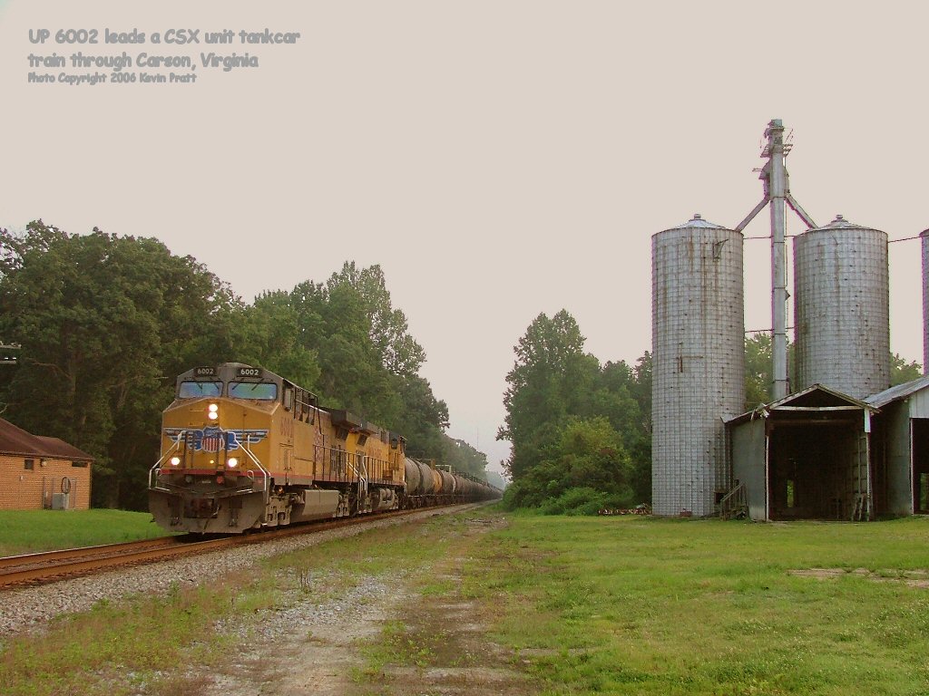 UP 6002 leads a CSX unit tankcar train through Carson, Virginia in July, 2006