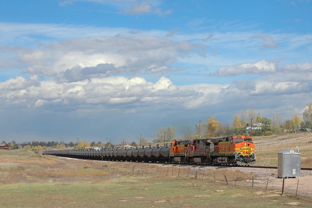BNSF 4753 leads a molten sulfur train south out of Fort Collins at Trilby Road.