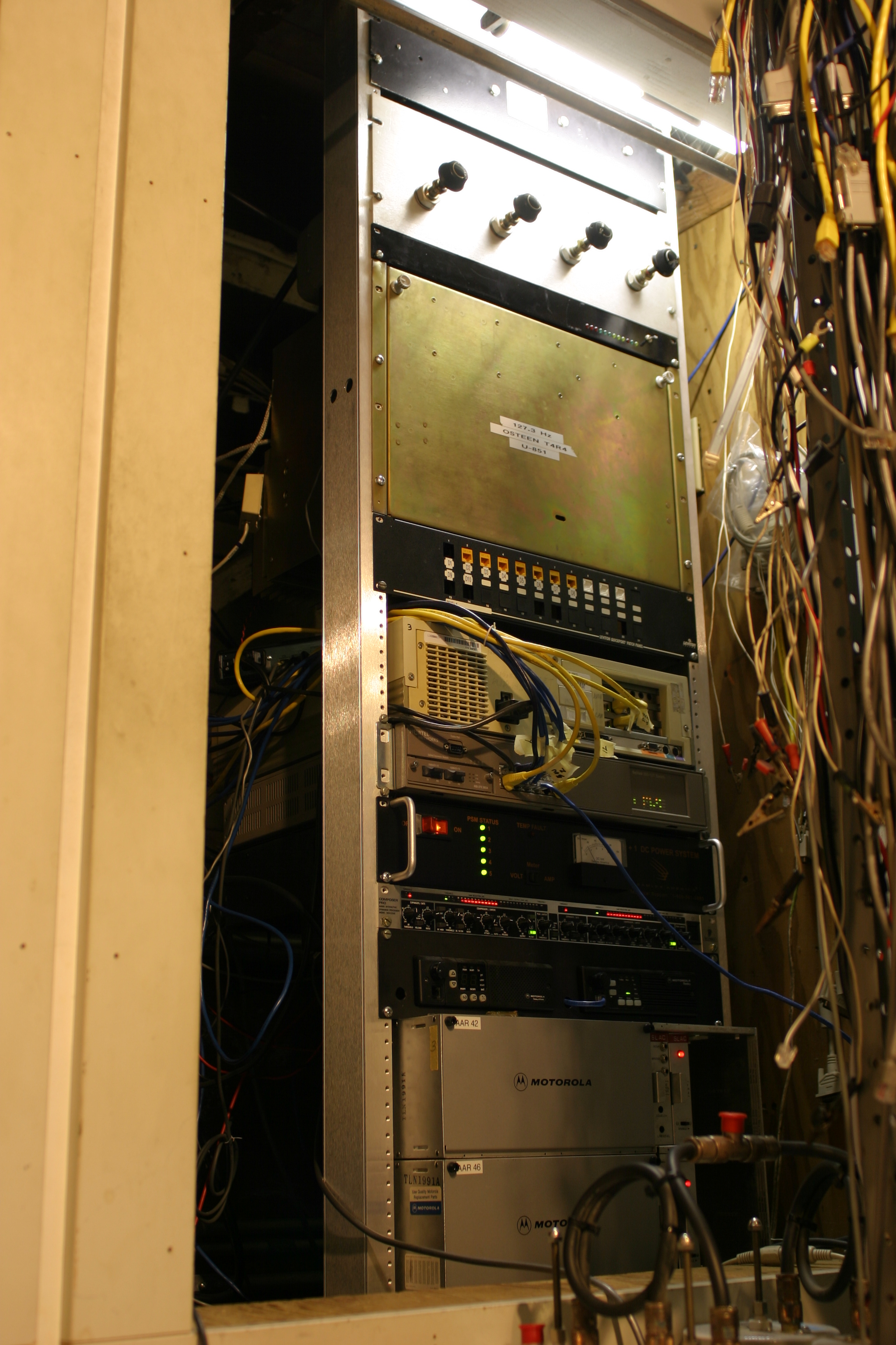 Stream receivers loacted near bottom of Rack. UP BAY receivers, Motorola SpectraTac, on Channels 42 and 46 are the 2 silver units. Above them is a Motorola GM300 radio for the BNSF Stockton Sub Stream. Other equipment in the rack is amateur radio repeater and network equipment.
